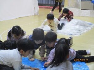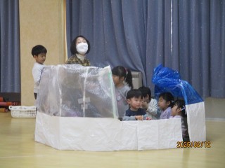 今日もペンギンさんになって…。年長さんの「みんな並んで~」の声でお散歩に出かけるところからお話が始まります。そのあとは…明日のおたのしみ!