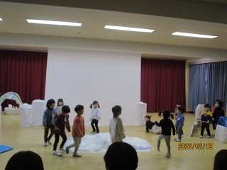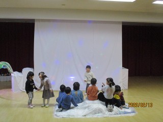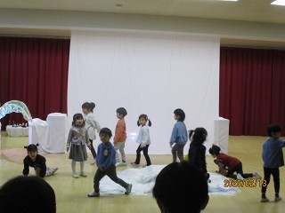 そのあと、年少さんも氷のお家から出てきて、みんなでペンギンになってお散歩。氷の山で遊んだり、海でお魚をとったりして遊びました。それぞれのペンギンの表現がとても素敵でした。