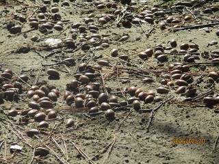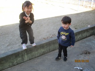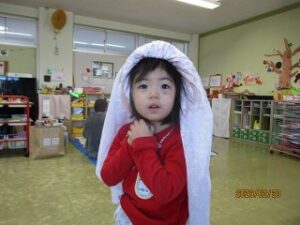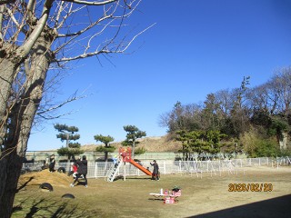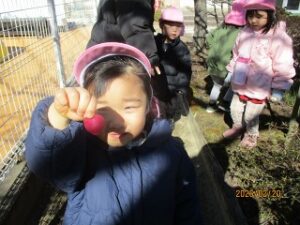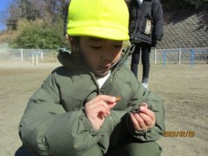 お山の上に行くと…「あれ?どんぐりがいっぱい!」そう、この前まで雪がかぶって忘れていましたが、秋にみんなで遊んだどんぐりがそのまま残っていたのでした。幼稚園のどんぐり、今年度は豊作だったんです。中にはもう芽が出ているどんぐりもあり、たくましく生長していることを感じました。次の季節に向かっているんですね。