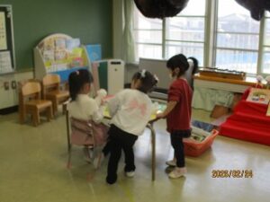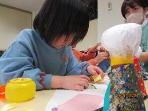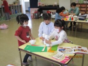 同じ部屋では、年中さんもおひなさまづくりをしていました。