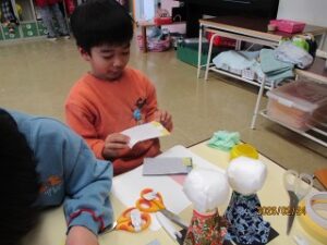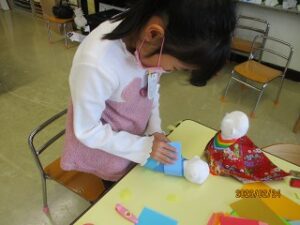 年長さんは、人形を作る職人さんのように集中して作っていました。