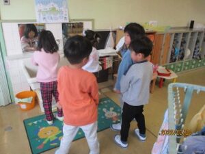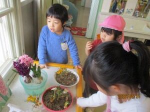 保育室ではヒヤシンスも咲き、とてもいい香りが広がっています。ポカポカ陽気に誘われて、みんなも植物もうれしそう。