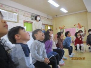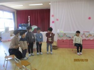 春らしい日差しを感じるようになりました。子どもたちにとってもうれしい、進級、入学の春がもうすぐ。今日は、年長さんへのありがとうの気持ちを込めて、ありがとうの会をしました。
