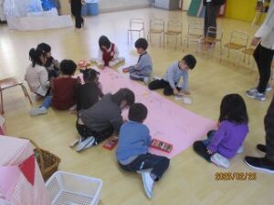 「次は、みんなでお絵描きをしましょう」今日は特別大きな大きな紙にお絵かきです。