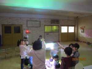 進行は年中さん。「最初は〇〇をします」…自分たちで考えたことをお話しました。年長さんもうれしそう!これまで年長さんと一緒に楽しんできた、かくれんぼやお絵描きをしました。