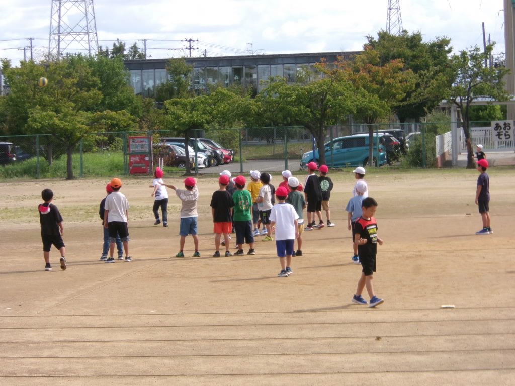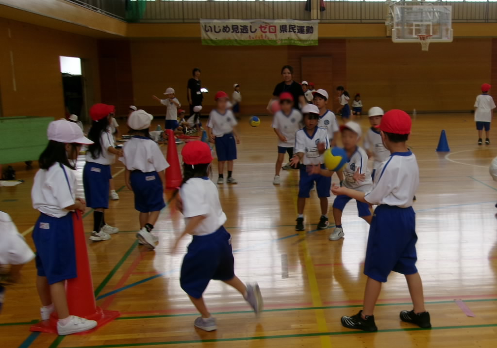 1年生のゴール投げゲームです。作戦をチームで考え、いざゲームを!。仲間と知恵と力を合わせる学びです。