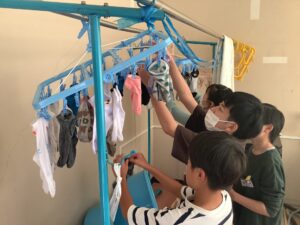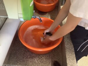 6年生が家庭科の「衣類の手入れで快適に」の学習で洗濯の学習をしました。自分の靴下を手洗いで、こすり洗いやつまみ洗いを駆使してきれいになるように頑張っていました。「なかなかきれいにならない・・・。」と汚れたものを洗濯する大変さを実感していたようです。