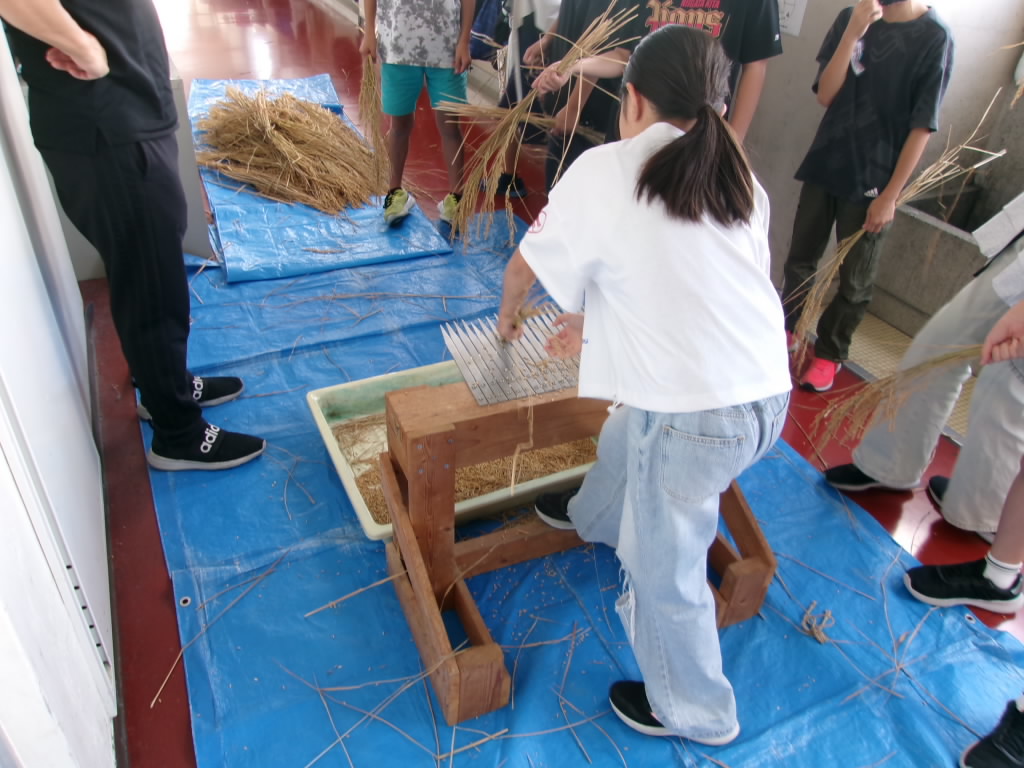 稲作の学習で「千歯扱ぎ(せんばこぎ)」体験。穂から籾(もみ)を外す作業です。今はコンバインで処理しますが、昔の人はこうやっていたんだなと実感を伴う学びです。