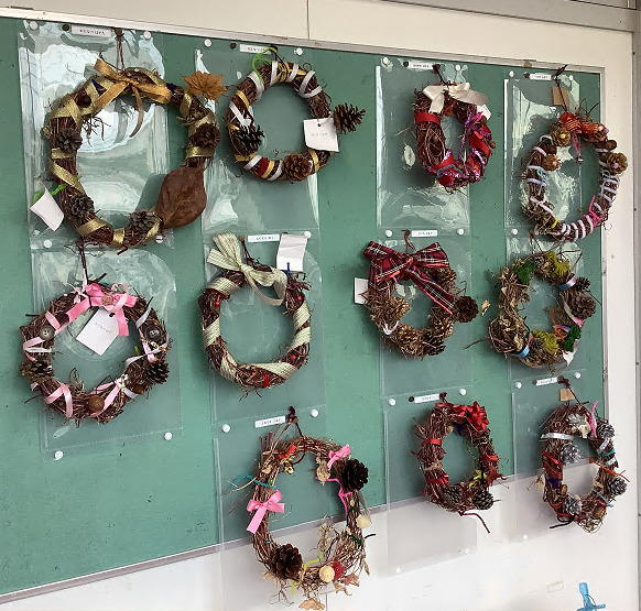 1年生の廊下にはアサガオのリースが飾られました。もう12月、クリスマスの雰囲気になりました。