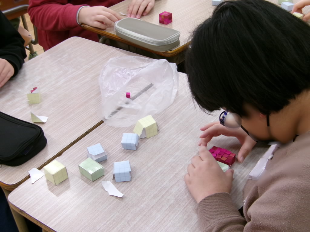 5年算数では、実際に作った立体の体積を1㎤の積み木で確かめていました。手は第2の脳と言われます。実際に頭の中で考えたことを手を使って作ってみることで実感を伴う確かな理解につながっていきます。