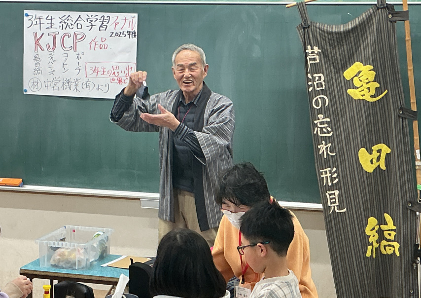 3年生が、総合の学習で育てた「綿」を使い亀田縞を使ったポーチづくりをしました。亀田縞応援隊の青山さんから、綿の扱いやポーチの作り方を教わり、ボランティアの皆さんにも協力していただき、素敵なポーチをつくることができました。