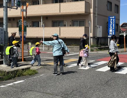 1年生が入学して3日目。元気いっぱいに登校しています。本日は下校指導を行いました。1年生が安全に下校できるようにと、たくさんの見守りボランティアの方が協力してくださっています。「右見て、左見て、もう一回右見て、手を挙げて」と、安全に気を付けて交差点も歩くことができました。
