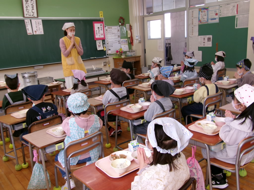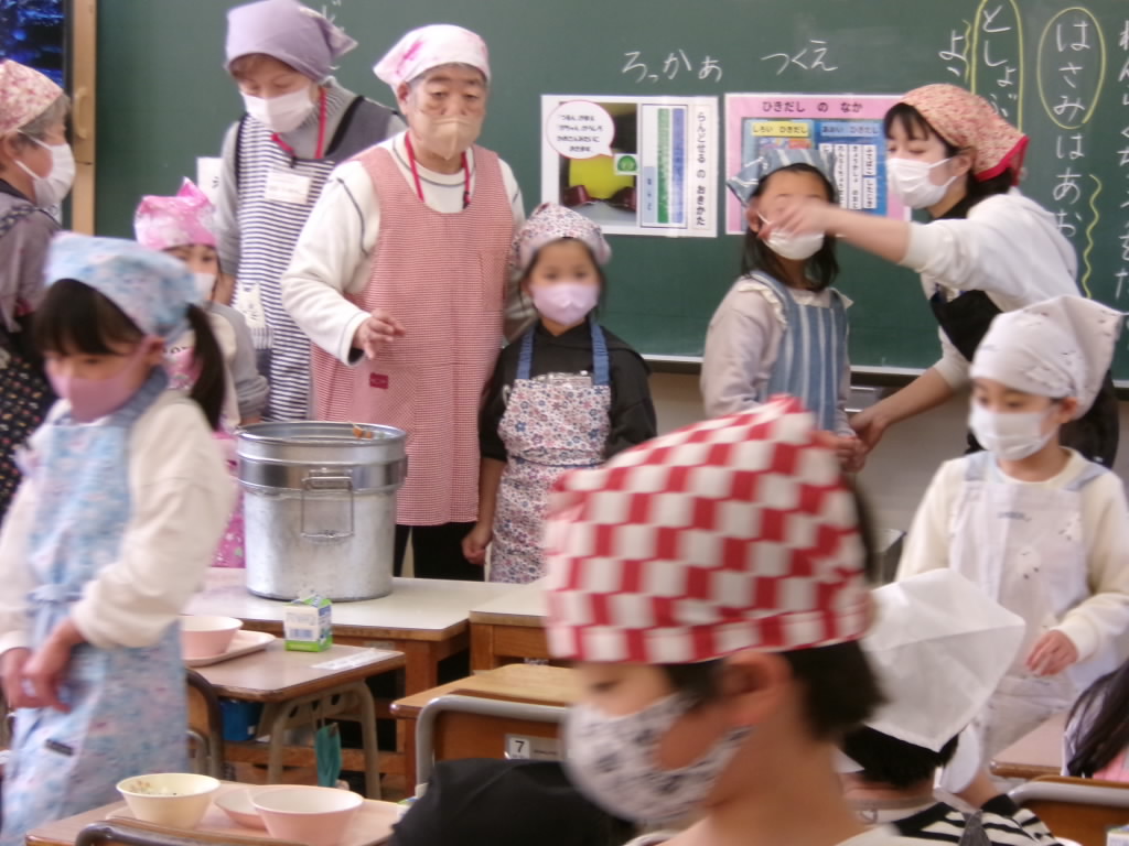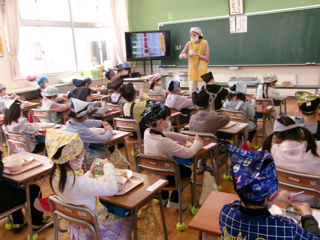 盛り付けと配膳には、地域の方々が給食補助ボランティアとして来てくださり、子どもたちの作業をサポートしてくださいました。おかげで、盛り付け係の子どもたちも、担任の先生も、たくさん助けていただきました。