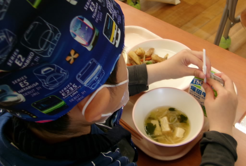 やっと「いただきます」です。「わかめごはん」は人気でした。塩味がちょうどよく、子どもたちはモリモリ食べていました。(残量ほとんどなしに…)