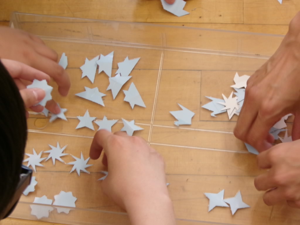 休憩の後、教室をのぞくと…線対称と点対称の形を手に取って確認していました。