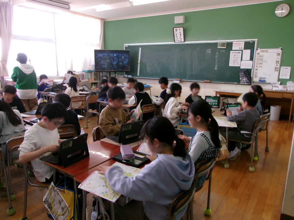 別の教室では地図帳を使ってクイズを作り、グループで問題を出し合って楽しく学びを進めていました。