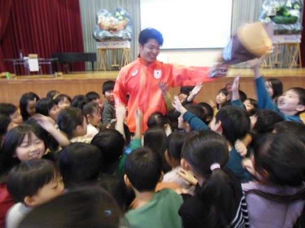 新潟日報社様が日本教育公務員弘済会新潟支部様の協力を得て、毎年県内の小学校2校、中学校2校を選んで、「ことばの学校」を実施しています。今年度は、亀田小学校がその2校の一つに選ばれました。「ことばの学校」では、様々な分野で活躍する方のお話を聞く中で、「言葉の力」を通じて、子どもたちの夢や共感する力を育むのが目的です。今回、講師としてお願いしたのが東京オリンピック、パリオリンピックで競泳日本代表となった水沼選手でした。現在、新潟医療福祉大学に勤務しながら、選手として頑張っています。子どもたちに、「プラスの言葉を自分自身にかけ続ける大切さ」と「言葉は自分や友達を勇気づける目に見えない金メダルだ」ということを教えていただきました。