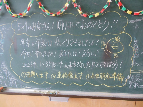 令和8年がスタートしました。今年もよろしくお願いいたします。初日はあいにくの悪天候となりました。強風のため、傘が壊れびしょびしょになって登校してきた人もいました。雨風の強い中、頑張って登校してきた皆さん、100点満点です!今朝の5年1組の黒板にも、「今日来ただけで、あなたは、えらい!」と書かれていた通りだと思います。今年は午年、新しい挑戦に踏み出すパワーを秘めた年です。いろいろなことに挑戦し、自分の好きなことや得意なことを見付けていってほしいと思います。