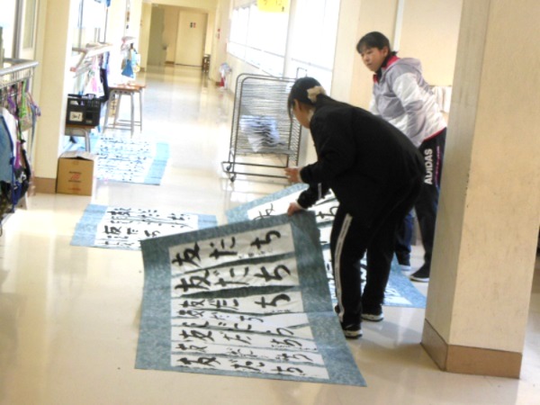 来週は校内書初め展示ウィークです。昨年末から練習を始め、冬休みもお家で何十枚も練習してきました。その中から、一番気に入っている作品を自分で選びました。そして今日の放課後、先生方が協力して掲示していました。準備はOKです!寒い中ですが、子どもたちの力作をどうぞご覧いただき、心は温まってください。
