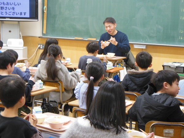 毎日おいしい給食、ありがとうございます。その給食の食材を作っている生産者の皆様と触れ合う「給食交流会訪問」を実施しました。今回は2年生と一緒に給食を食べていただき、子どもたちの質問に答えていただきました。井浦さんはニンジンとキャベツを、石本さんは長ねぎ、白菜、サツマイモを作っているそうです。これからは食べるときに、お二人の顔を思い浮かべて残さずいただきましょう。