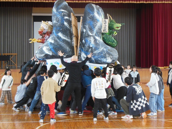 あと令和7年度も登校する日が30日を切りました。学校では、様々な場面で次年度への引継ぎが始まっています。昨日は、4年生から3年生へ木遣りの引継ぎ会が行われました。亀田小学校の4年生は、毎年夏の亀田まつりに参加します。そのため、木遣りに始まり、木遣りで終わるというくらい、1年間練習を頑張ってきました。岩万燈保存会の皆様からは、多大なるご支援ご協力をいただきましたことに感謝を申し上げます。今年の4年生最後となる木遣りと岩万燈の押し合いを間近で見て、3年生は「とてもかっこよかった!」「すごい迫力で感動した!」「太鼓をやってみたい!」と語っていました。4年生の皆さん、素晴らしいパフォーマンスありがとうございました。今度は高学年として亀田小学校をリードしてください。