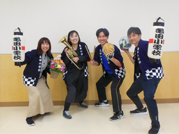 3月には6名の先生方とお別れをしました。4月、新しく7名の先生方を迎え亀田小学校は令和8年度をスタートしました。昨日は着任式と前期始業式、今日は入学式を行いました。44名のピカピカの一年生を迎え、全校児童は345名です。亀田小学校の新たな挑戦として、チーム担任制を導入します。上からチームA、チームT、チームC、チームK、チームGです。今年度も、教職員一同全力で頑張ります。ご支援ご協力を、どうぞよろしくお願いいたします。