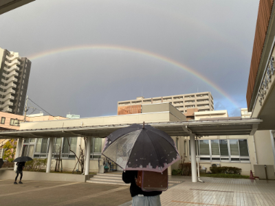 今朝は、多くの子どもたちが、「虹見たよー!」と言いながら登校です。きっと今日はいいことあるがありますよ。写真をよく見ると虹が二重にかかっているんですよ。 2年1組は図工の学習で、昔話の一場面を …