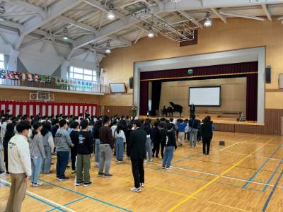 今日は、令和7年度後期の終業式のため、朝から体育館に全校児童が集まりました。今朝は気温がかなり下がったので、ジェットヒーターをたきました。 まずは、全校で校歌を歌いました。素敵な笹口小の校歌、素敵 …