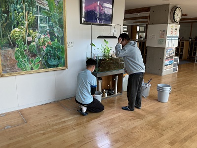 笹口小学校の多目的ホールには、大きな水槽があります。5種類くらいの生き物が生活しているようです。地域の専門学校の協力によって維持管理してもらっています。学生さんが生き物の世話をしていると、自然と子ど …