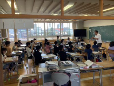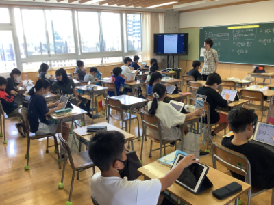 5年1組の社会は「育てる漁業」についてです。養殖漁業や栽培漁業などについて理解を深めています。担任の先生が、漁業にまつわるお話をして子どもたちがその話を興味深そうに聞き、質問しながら授業が進んでいました。