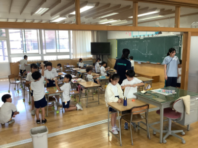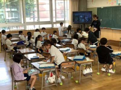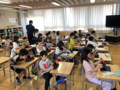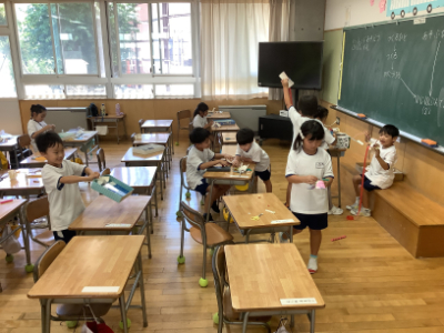 1年1組は図工をしていました。友だちと一緒に材料を選んだり作ったものを見合ったりしてとても楽しそうです。