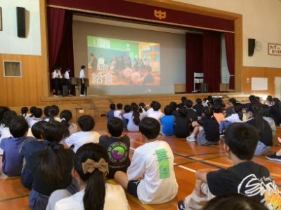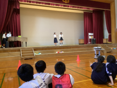 最初に、中学1年生の皆さんが、中学校の1日の紹介をし、その後に学校クイズをしてくれました。
