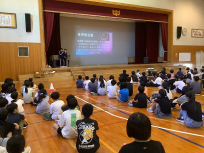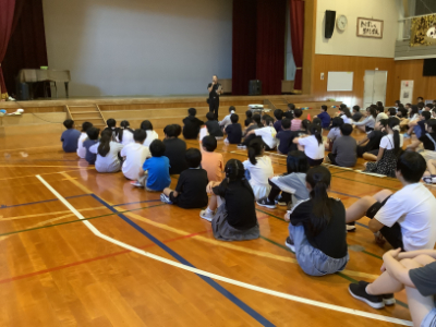 映像も使いながら分かりやすく説明してくれました。笹口小学校の卒業生が明るく迎えてくれたと6年生の担任の先生が喜んでいました。中学1年生の6年生時代の担任のN先生は、帰ってきた6年生の先生からお話を聞き、「会いたいなぁ。」とおっしゃっていました。