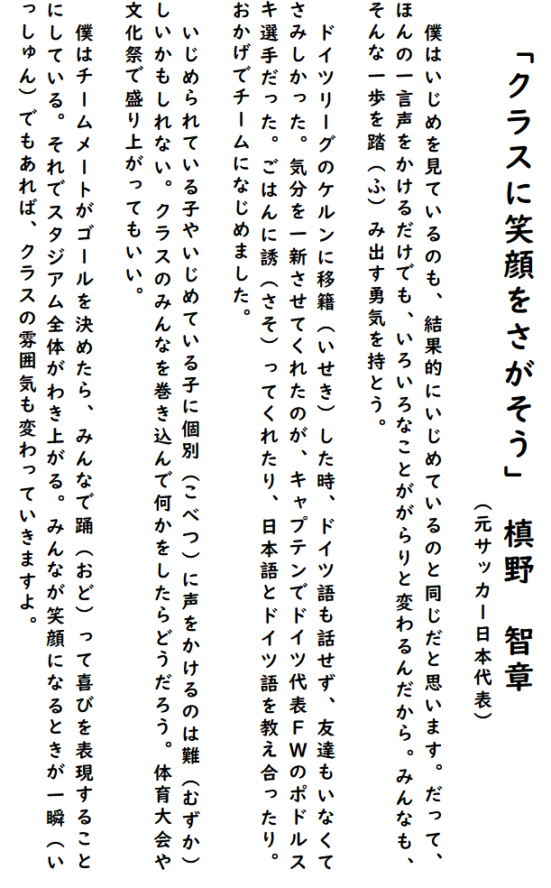 今日から10月です。10月~11月にいじめの発生件数が増えるというデータがあることから、今日は昼の放送で、元サッカー日本代表の槙野智章選手のメッセージを紹介し、引き続き笑顔あふれるクラス、いじめのない10月になるよう意識していくことを、みんなで確認しました。