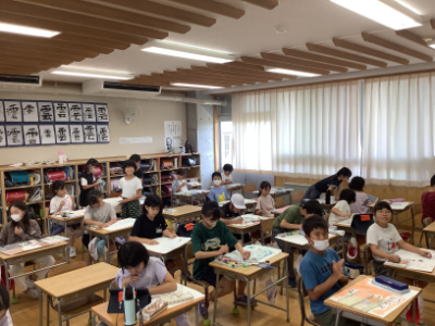 4年生は図工で絵を描いていました。もしかしたら、笹口祭に掲示する作品になるかもしれないので作品はお楽しみですが、それぞれの作品に個性が出ていてとても素敵です。筆を手でしごいて絵の具を飛ばしたりティッシュでたたいたり、様々な技法を使って色を付けていました。