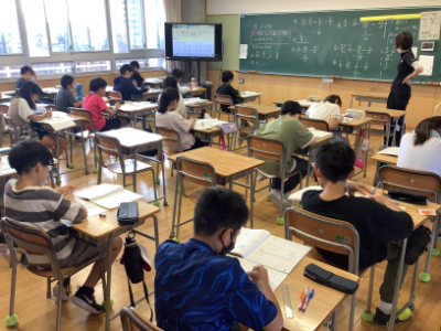 5年2組の算数です。「特訓コース」と名付けた、分母の違う分数のひき算の練習をしていました。以前に学習した通分を使って問題に挑みます。通分をするためには、倍数の知識も必要です。日々の学習が積み重ねられて知識として定着する様子がよく分かります。