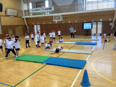 マットに横たわってゴロゴロ。いろいろな運動に挑戦です。「一緒にやろう!」と誘われてしまいました。