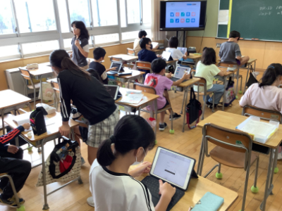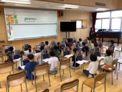 2年1組の音楽です。担任の先生の素敵なピアノのメロディーに合わせて「この 空 とぼう」を歌っています。子どもたちの歌声も素敵です。タブレットに向かっているのは、自分の歌っている様子を動画に撮るためです。自分の歌っている様子をみることはなかなかないですよね。表情や口の開け方も確認できます。