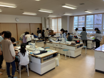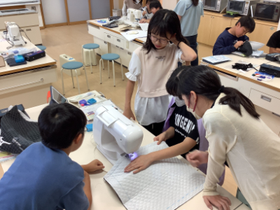 6年生は、ナップザックづくりです。ミシンがうまく使えるでしょうか。
