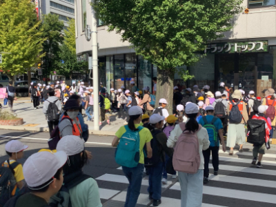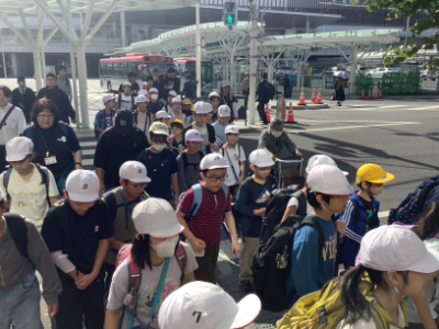 行き交う人の注目を浴びながら笹口小の大集団が進みます。