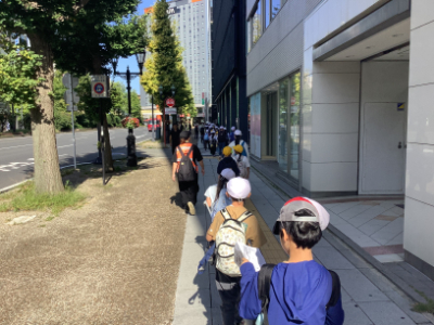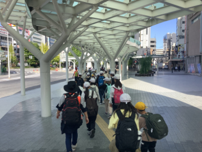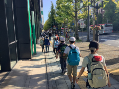 帰りは少しお疲れ気味の子も。高学年がリュックサックを持ってあげたり励ましたりしながらみんなでがんばります。