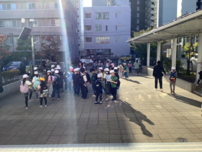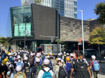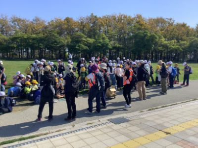 昨日は雨、でも今日はしっかりと晴れ。もってますね~笹口っ子。最高の秋晴れの中のけやきっこ遠足となりました。けやき班リーダーの6年生のところへ全校児童が集まってきます。