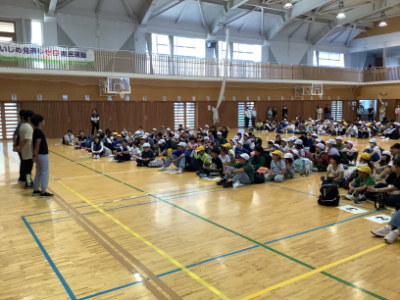 6年生代表の元気なかけ声で「いってきまーす!」このように6年生が率先して明るい雰囲気を作ってくれるところが素敵です。6年生代表のおかげで全校のみんなが「よしやるぞ!」という気持ちになりました。