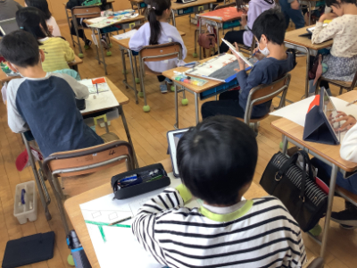 4年生は、絵を描いていました。1枚目が完成しそうな子、1枚目が完成し「2枚目が描きたい」と2枚目の子。中には3枚目という子もいます。作品展にはどの絵を展示するのでしょうか?楽しみですね。