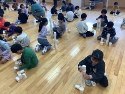 1年生は2クラスとも教室にいません。と思ったら何と多目的室で、紙コップタワーをつくっていました。