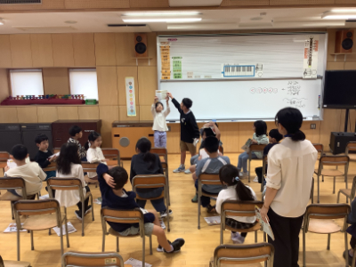 2年生の音楽です。歌集の曲を聴いて「くりかえし」の場所を探していました。ある子が、自分が見つけた「くりかえし」の場所を歌集をみんなの方に向けながら伝えていると、ほかの子が出て行って「ここだよ!」とサポートをしてくれました。