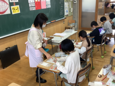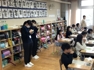 養護教諭実習に入っているお2人の学生さんも熱心にメモをとっています。途中、鏡を配るなどの様々な授業のお手伝いもしてくださいました。