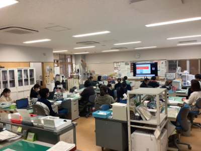 先生たちも学習です。今日は食物アレルギーについての研修です。食物アレルギー研修は子どもたちの命にかかわるとても大切な研修ですので、定期的に実施しています。食物アレルギー反応は、それまでアレルギー反応がない人に突然起きることもあります。全ての子どもたちにかかわるという意識をもって今後も対策を講じていきます。