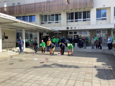 今日は、午前中に、笹口校区の防災訓練が行われました。笹口校区の皆様が学校に集まり、区の総務課や消防団の方にもご協力をいただきました。自主防災会長のごあいさつから訓練のスタートです。