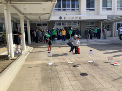 学校玄関前では、水消化器の体験を行いました。